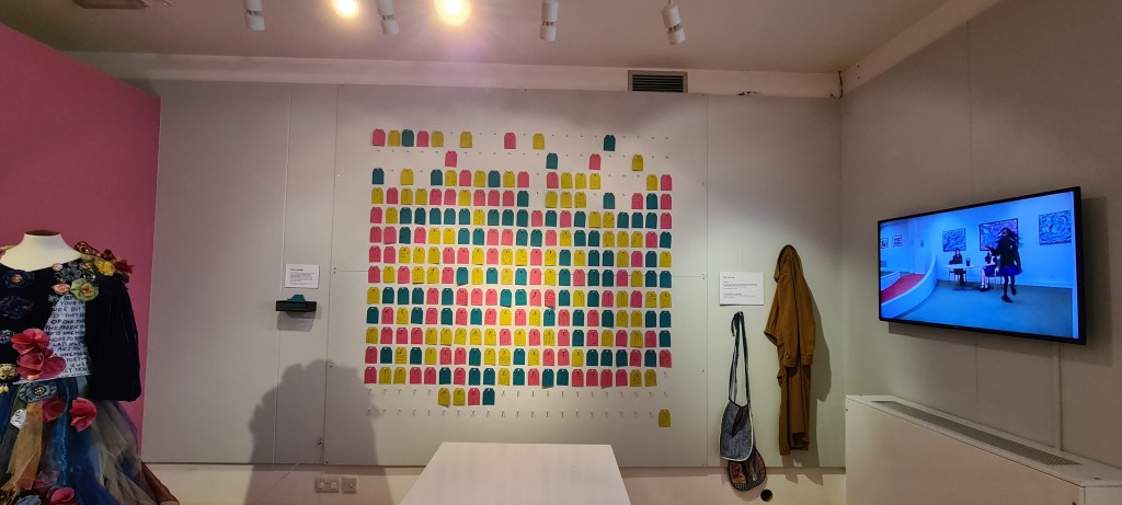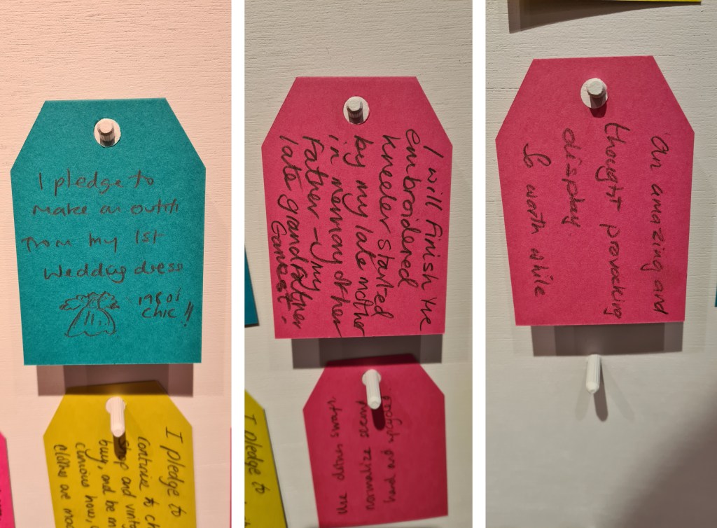 The feedback wall in the exhibition was also designed as an interactive art piece highlighting textile waste, with each of 315 pegs representing a garment sent to landfill every 17 seconds.